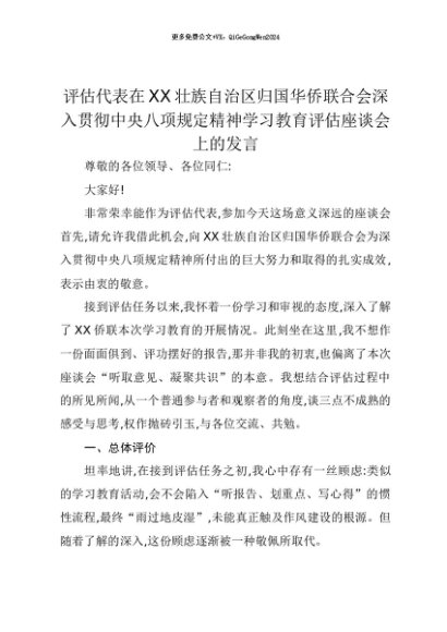 【七哥公文】2025年:【七哥公文】评估代表在XX壮族自治区归国华侨联合会深入贯彻中央八项规定精神学习教育评估座谈会上的发言+更多免费公文+VX:QiGeGongWen2024+更多免费公文+VX:QiGeGongWen2024
