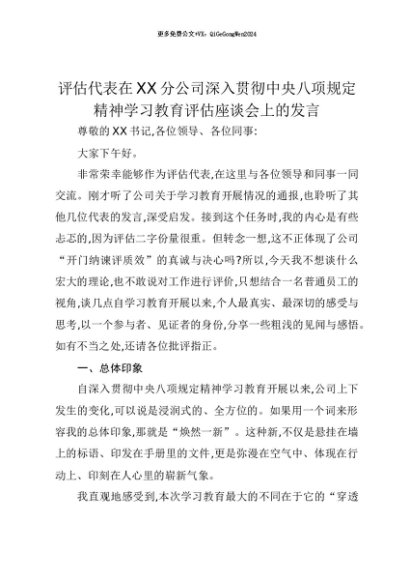 【七哥公文】2025年:【七哥公文】评估代表在XX分公司深入贯彻中央八项规定精神学习教育评估座谈会上的发言+更多免费公文+VX:QiGeGongWen2024+更多免费公文+VX:QiGeGongWen2024