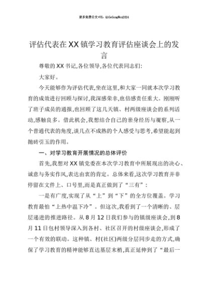 【七哥公文】2025年:【七哥公文】评估代表在XX镇贯彻中央八项规定精神学习教育评估座谈会上的发言+更多免费公文+VX:QiGeGongWen2024+更多免费公文+VX:QiGeGongWen2024