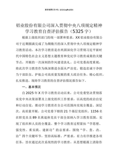 【七哥公文】2025年:【七哥公文】铝业股份有限公司深入贯彻中央八项规定精神学习教育自查评估报告(5325字)+更多免费公文+VX:QiGeGongWen2024+更多免费公文+VX:QiGeGongWen2024