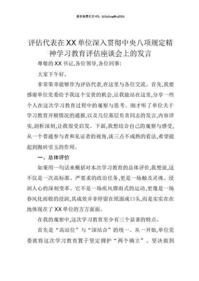 【七哥公文】2025年:【七哥公文】评估代表在XX单位深入贯彻中央八项规定精神学习教育评估座谈会上的发言+更多免费公文+VX:QiGeGongWen2024+更多免费公文+VX:QiGeGongWen2024