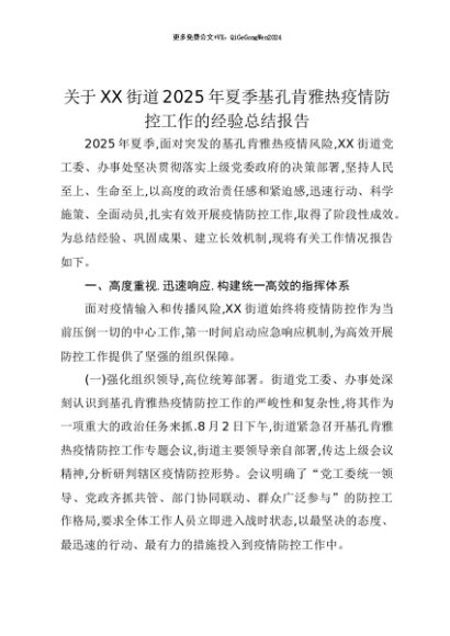 【七哥公文】2025年:【七哥公文】关于XX街道2025年夏季基孔肯雅热疫情防控工作的经验总结报告+更多免费公文+VX:QiGeGongWen2024+更多免费公文+VX:QiGeGongWen2024