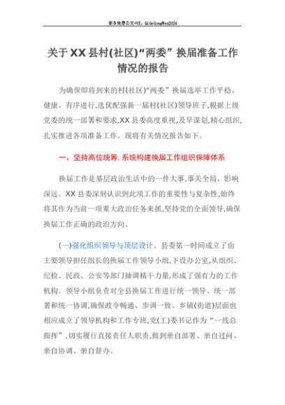 【七哥公文】2025年:【七哥公文】关于XX县村(社区)“两委”换届准备工作情况的报告+更多免费公文+VX:QiGeGongWen2024+更多免费公文+VX:QiGeGongWen2024