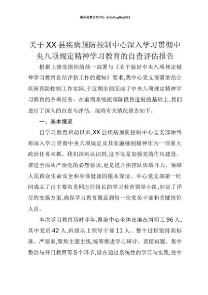 【七哥公文】2025年:【七哥公文】关于XX县疾病预防控制中心深入学习贯彻中央八项规定精神学习教育的自查评估报告+更多免费公文+VX:QiGeGongWen2024+更多免费公文+VX:QiGeGongWen2024