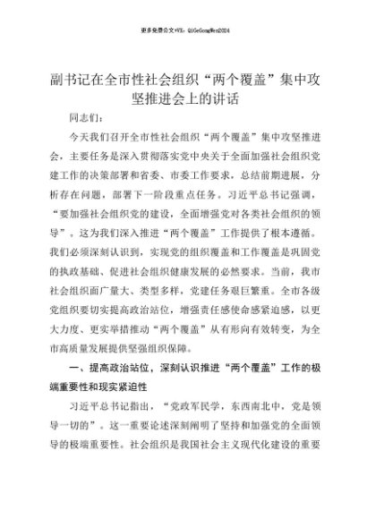 【七哥公文】2025年:【七哥公文】副书记在全市性社会组织“两个覆盖”集中攻坚推进会上的讲话+更多免费公文+VX:QiGeGongWen2024+更多免费公文+VX:QiGeGongWen2024