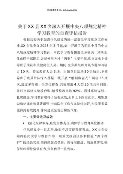 【七哥公文】2025年:【七哥公文】关于XX县XX乡深入开展中央八项规定精神学习教育的自查评估报告+更多免费公文+VX:QiGeGongWen2024+更多免费公文+VX:QiGeGongWen2024