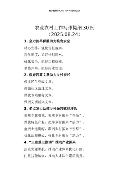 【七哥公文】2025年:【七哥公文】农业农村工作写作提纲30例(2025.08.24)+更多免费公文+VX:QiGeGongWen2024+更多免费公文+VX:QiGeGongWen2024