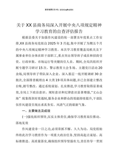 【七哥公文】2025年:【七哥公文】关于XX县商务局深入开展中央八项规定精神学习教育的自查评估报告+更多免费公文+VX:QiGeGongWen2024+更多免费公文+VX:QiGeGongWen2024