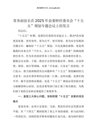 【七哥公文】2025年:【七哥公文】常务副县长在2025年县委财经委员会“十五五”规划专题会议上的发言+更多免费公文+VX:QiGeGongWen2024+更多免费公文+VX:QiGeGongWen2024