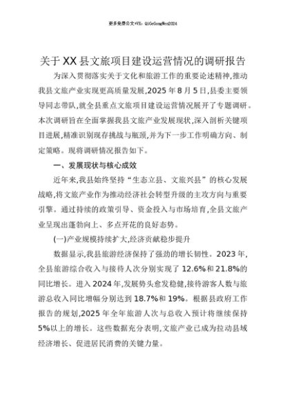 【七哥公文】2025年:【七哥公文】关于XX县文旅项目建设运营情况的调研报告+更多免费公文+VX:QiGeGongWen2024+更多免费公文+VX:QiGeGongWen2024