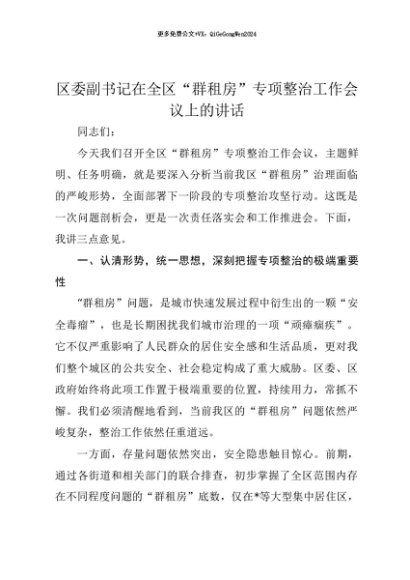 【七哥公文】2025年:【七哥公文】区委副书记在全区“群租房”专项整治工作会议上的讲话+更多免费公文+VX:QiGeGongWen2024+更多免费公文+VX:QiGeGongWen2024