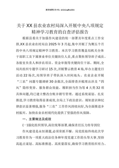 【七哥公文】2025年:【七哥公文】关于XX县农业农村局深入开展中央八项规定精神学习教育的自查评估报告+更多免费公文+VX:QiGeGongWen2024+更多免费公文+VX:QiGeGongWen2024