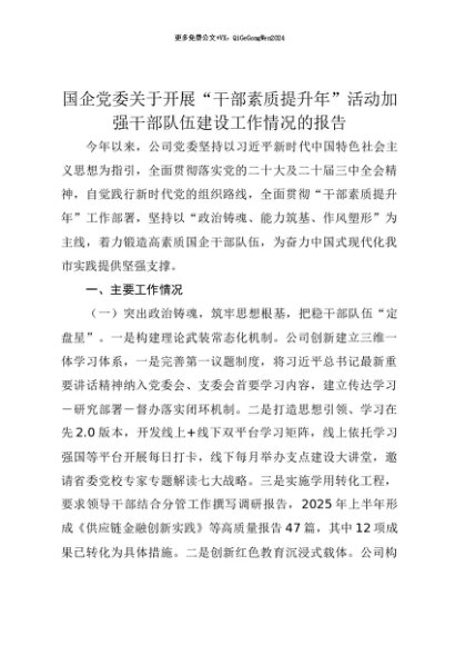 【七哥公文】2025年:【七哥公文】国企党委关于开展“干部素质提升年”活动加强干部队伍建设工作情况的报告+更多免费公文+VX:QiGeGongWen2024+更多免费公文+VX:QiGeGongWen2024