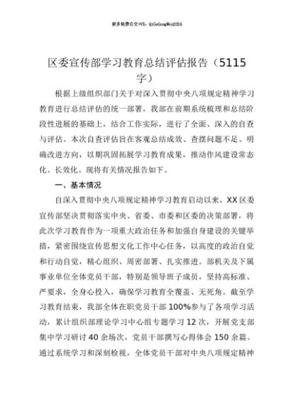 【七哥公文】2025年:【七哥公文】区委宣传部贯彻落实中央八项规定精神学习教育总结评估报告(5115字)+更多免费公文+VX:QiGeGongWen2024+更多免费公文+VX:QiGeGongWen2024