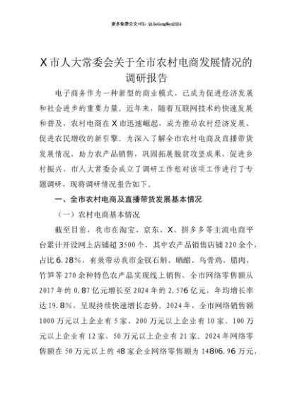 【七哥公文】2025年:【七哥公文】X市人大常委会关于全市农村电商发展情况的调研报告+更多免费公文+VX:QiGeGongWen2024+更多免费公文+VX:QiGeGongWen2024