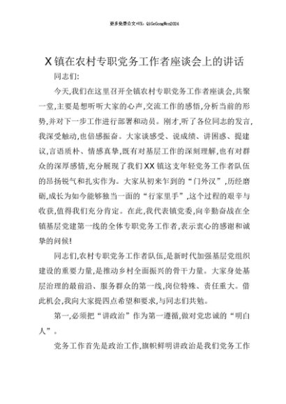 【七哥公文】2025年:【七哥公文】X镇在农村专职党务工作者座谈会上的讲话+更多免费公文+VX:QiGeGongWen2024+更多免费公文+VX:QiGeGongWen2024