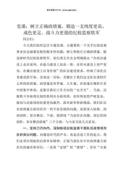 【七哥公文】2025年:【七哥公文】党课讲稿:树立正确政绩观,锻造一支纯度更高、成色更足、战斗力更强的纪检监察铁军+更多免费公文+VX:QiGeGongWen2024+更多免费公文+VX:QiGeGongWen2024
