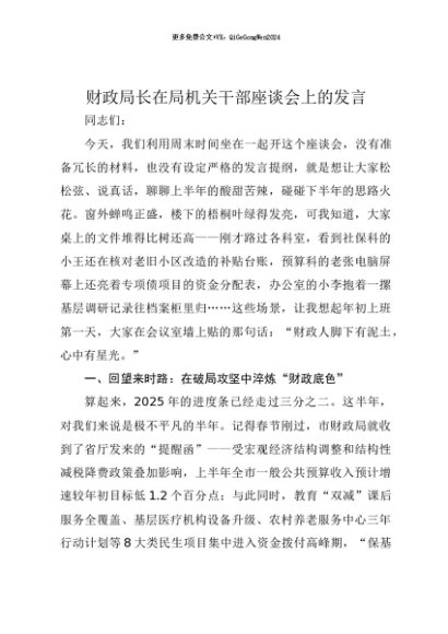 【七哥公文】2025年:【七哥公文】财政局长在局机关干部座谈会上的发言+更多免费公文+VX:QiGeGongWen2024+更多免费公文+VX:QiGeGongWen2024