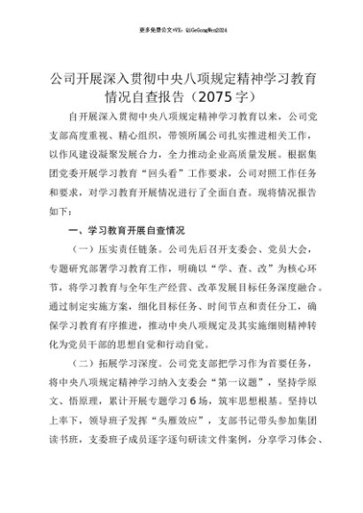 【七哥公文】2025年:【七哥公文】公司开展深入贯彻中央八项规定精神学习教育情况自查报告(2075字)+更多免费公文+VX:QiGeGongWen2024+更多免费公文+VX:QiGeGongWen2024