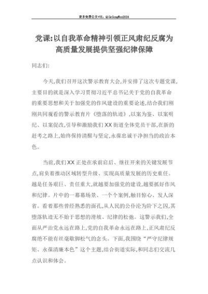 【七哥公文】2025年:【七哥公文】党课讲稿:以自我革命精神引领正风肃纪反腐为高质量发展提供坚强纪律保障+更多免费公文+VX:QiGeGongWen2024+更多免费公文+VX:QiGeGongWen2024
