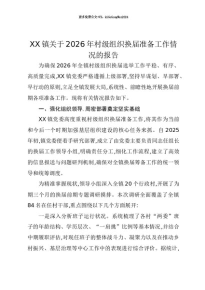 【七哥公文】2025年:【七哥公文】XX镇关于2026年村级组织换届准备工作情况的报告+更多免费公文+VX:QiGeGongWen2024+更多免费公文+VX:QiGeGongWen2024