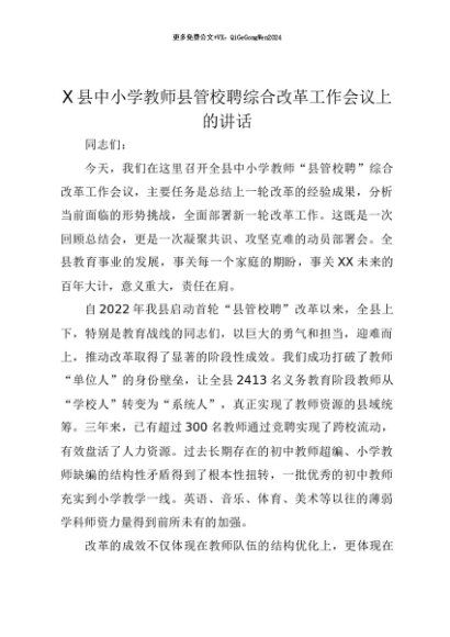 【七哥公文】2025年:【七哥公文】X县中小学教师县管校聘综合改革工作会议上的讲话+更多免费公文+VX:QiGeGongWen2024+更多免费公文+VX:QiGeGongWen2024
