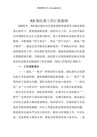 【七哥公文】2025年:【七哥公文】XX镇纪委工作汇报提纲+更多免费公文+VX:QiGeGongWen2024+更多免费公文+VX:QiGeGongWen2024