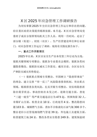 【七哥公文】2025年:【七哥公文】X区2025年应急管理工作调研报告+更多免费公文+VX:QiGeGongWen2024+更多免费公文+VX:QiGeGongWen2024