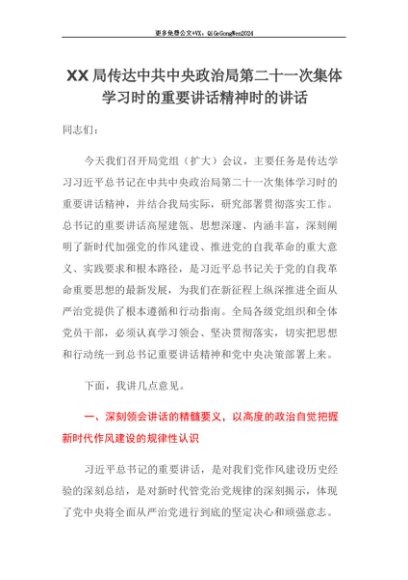 【七哥公文】2025年:【七哥公文】XX局传达中共中央政治局第二十一次集体学习时的重要讲话精神时的讲话+更多免费公文+VX:QiGeGongWen2024+更多免费公文+VX:QiGeGongWen2024