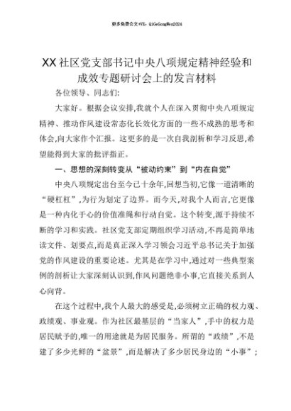 【七哥公文】2025年:【七哥公文】XX社区党支部书记中央八项规定精神经验和成效专题研讨会上的发言材料+更多免费公文+VX:QiGeGongWen2024+更多免费公文+VX:QiGeGongWen2024