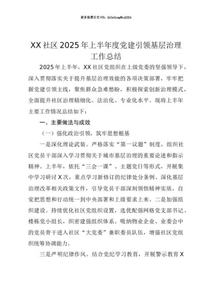 【七哥公文】2025年:【七哥公文】XX社区2025年上半年度党建引领基层治理工作总结+更多免费公文+VX:QiGeGongWen2024+更多免费公文+VX:QiGeGongWen2024