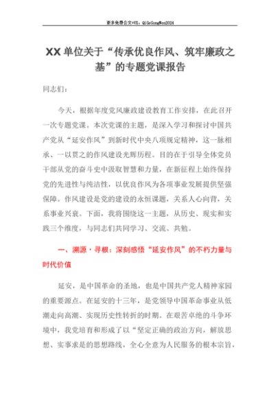 【七哥公文】2025年:【七哥公文】XX单位关于“传承优良作风、筑牢廉政之基”的专题党课报告+更多免费公文+VX:QiGeGongWen2024+更多免费公文+VX:QiGeGongWen2024