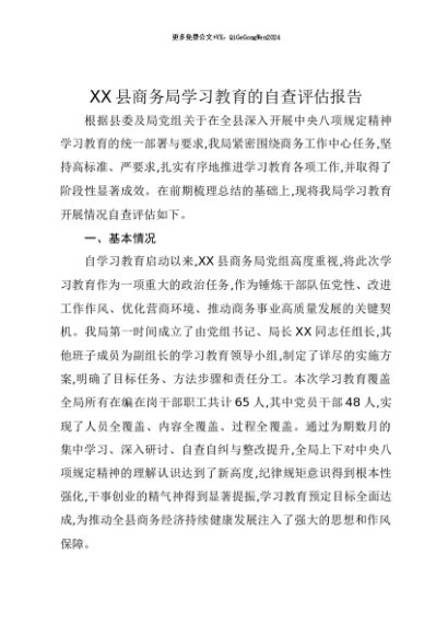 【七哥公文】2025年:【七哥公文】XX县商务局贯彻中央八项规定精神学习教育的自查评估报告+更多免费公文+VX:QiGeGongWen2024+更多免费公文+VX:QiGeGongWen2024