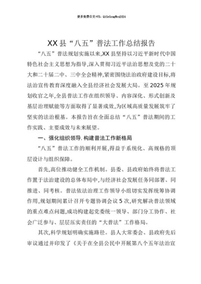 【七哥公文】2025年:【七哥公文】XX县“八五”普法工作总结报告+更多免费公文+VX:QiGeGongWen2024+更多免费公文+VX:QiGeGongWen2024