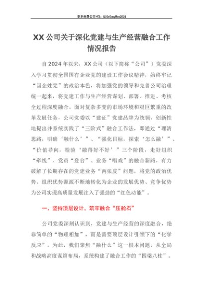 【七哥公文】2025年:【七哥公文】XX公司关于深化党建与生产经营融合工作情况报告+更多免费公文+VX:QiGeGongWen2024+更多免费公文+VX:QiGeGongWen2024