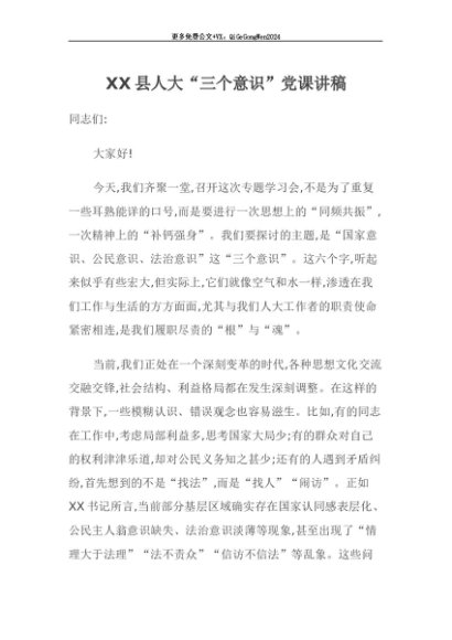 【七哥公文】2025年:【七哥公文】XX县人大“三个意识”党课讲稿+更多免费公文+VX:QiGeGongWen2024+更多免费公文+VX:QiGeGongWen2024