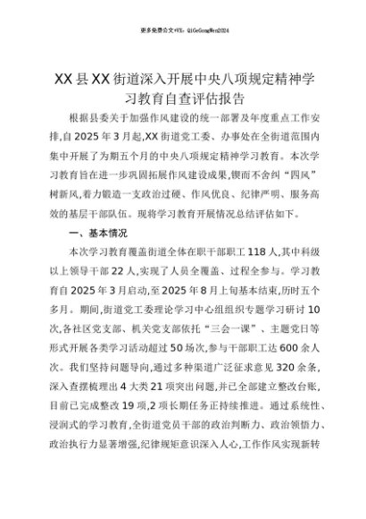 【七哥公文】2025年:【七哥公文】XX县XX街道深入开展中央八项规定精神学习教育自查评估报告+更多免费公文+VX:QiGeGongWen2024+更多免费公文+VX:QiGeGongWen2024