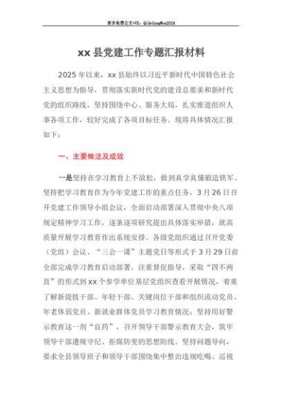【七哥公文】2025年:【七哥公文】xx县党建工作专题汇报材料+更多免费公文+VX:QiGeGongWen2024+更多免费公文+VX:QiGeGongWen2024