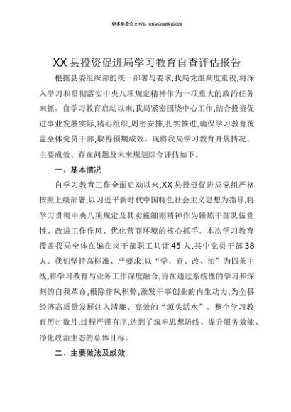 【七哥公文】2025年:【七哥公文】XX县投资促进局中央八项规定精神学习教育自查评估报告+更多免费公文+VX:QiGeGongWen2024+更多免费公文+VX:QiGeGongWen2024