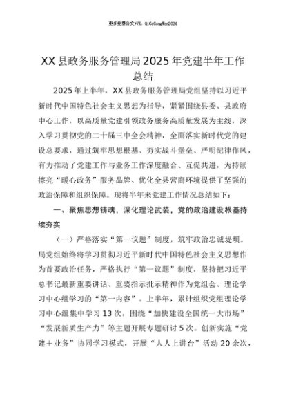 【七哥公文】2025年:【七哥公文】XX县政务服务管理局2025年党建半年工作总结+更多免费公文+VX:QiGeGongWen2024+更多免费公文+VX:QiGeGongWen2024