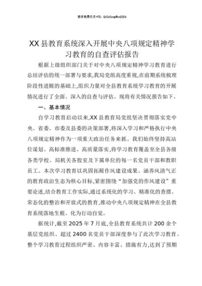 【七哥公文】2025年:【七哥公文】XX县教育系统深入开展中央八项规定精神学习教育的自查评估报告+更多免费公文+VX:QiGeGongWen2024+更多免费公文+VX:QiGeGongWen2024