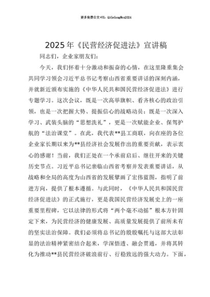 【七哥公文】2025年:【七哥公文】2025年《民营经济促进法》宣讲稿+更多免费公文+VX:QiGeGongWen2024+更多免费公文+VX:QiGeGongWen2024