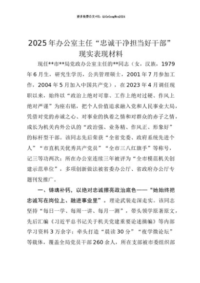 【七哥公文】2025年:【七哥公文】2025年办公室主任“忠诚干净担当好干部”现实表现材料+更多免费公文+VX:QiGeGongWen2024+更多免费公文+VX:QiGeGongWen2024