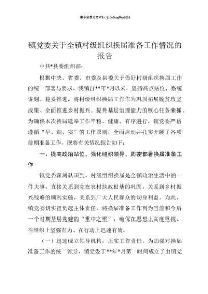 【七哥公文】2025年:【七哥公文】镇党委关于全镇村级组织换届准备工作情况的报告+更多免费公文+VX:QiGeGongWen2024+更多免费公文+VX:QiGeGongWen2024