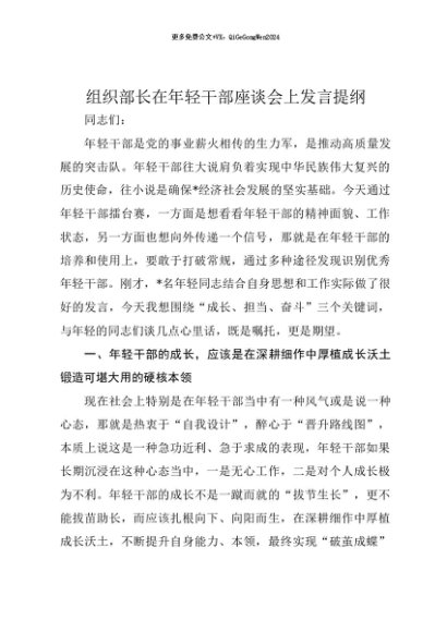 【七哥公文】2025年:【七哥公文】组织部长在年轻干部座谈会上发言提纲+更多免费公文+VX:QiGeGongWen2024+更多免费公文+VX:QiGeGongWen2024