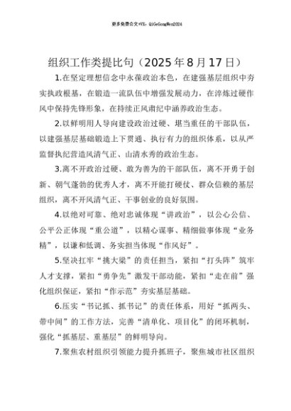 【七哥公文】2025年:【七哥公文】组织工作类提比句(2025年8月17日)+更多免费公文+VX:QiGeGongWen2024+更多免费公文+VX:QiGeGongWen2024