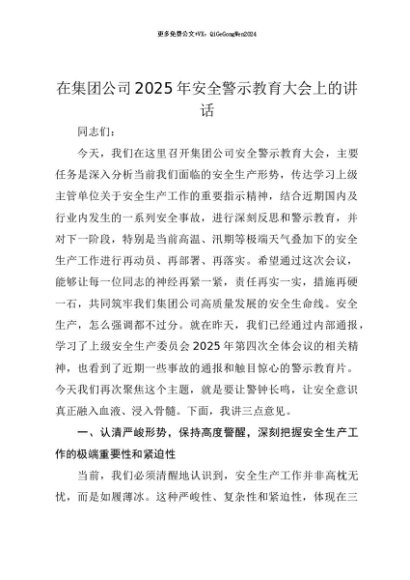 【七哥公文】2025年:【七哥公文】在集团公司2025年安全警示教育大会上的讲话+更多免费公文+VX:QiGeGongWen2024+更多免费公文+VX:QiGeGongWen2024