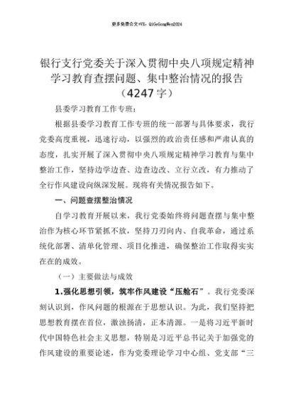 【七哥公文】2025年:【七哥公文】银行支行党委关于深入贯彻中央八项规定精神学习教育查摆问题、集中整治情况的报告(4247字)+更多免费公文+VX:QiGeGongWen2024+更多免费公文+VX:QiGeGongWen2024