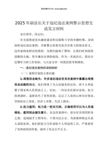 【七哥公文】2025年:【七哥公文】2025年副县长关于违纪违法案例警示思想交流发言材料+更多免费公文+VX:QiGeGongWen2024+更多免费公文+VX:QiGeGongWen2024