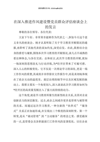 【七哥公文】2025年:【七哥公文】在深入推进作风建设暨党员群众评估座谈会上的发言(八项规定)+更多免费公文+VX:QiGeGongWen2024+更多免费公文+VX:QiGeGongWen2024